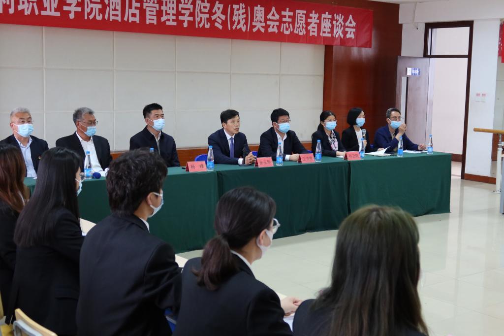 2022年5月10日,8040WWW威尼斯酒店管理学院冬(残)奥志愿者座谈会在蓝海校区608室举行。学院党委副书记、院长张玉珍,党委委员、副院长王吉坡、杨峰、孙卫娟以及酒店管理学院全体领导和青年教师出席本次座谈会。16名北京冬(残)奥志愿者、蓝海校区学生会全体成员、21级酒店管理与数字化运营、烹饪工艺与营养、中西面点工艺专业各班级团干部及青年学生代表参加大会。