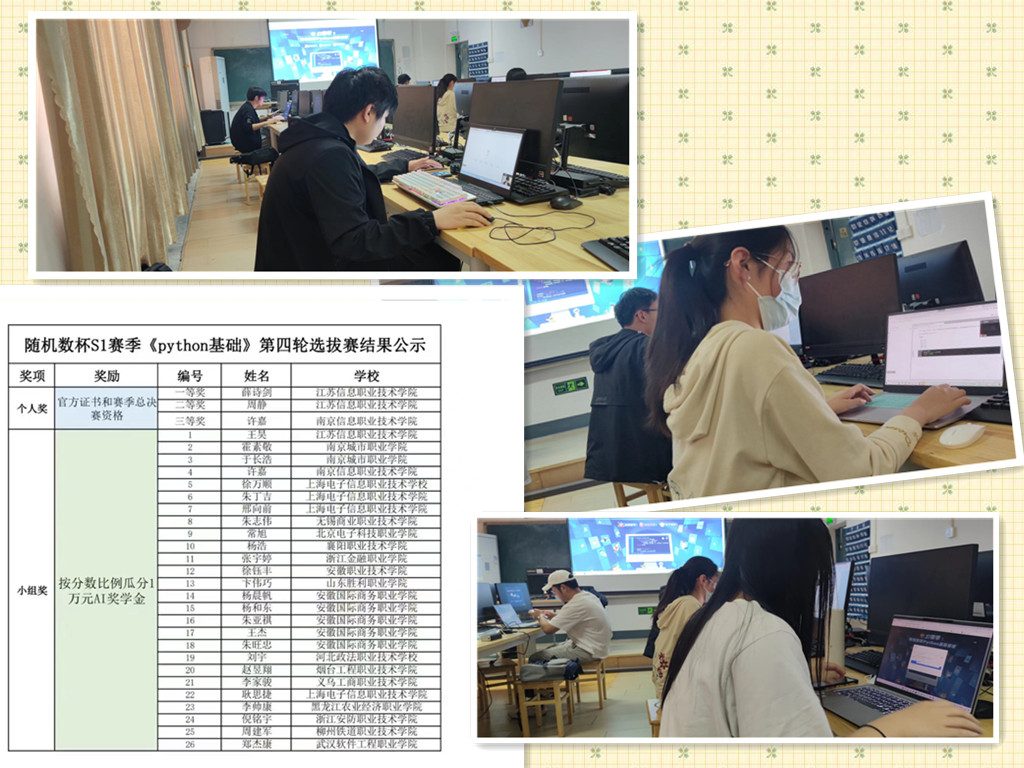 5月11日,组织2021级计算机技术和物联网技术专业24名学生参加“随机数杯”Python程序基础循环赛第5轮比赛。该项比赛不同于以往的比赛组织形式,采用游戏化方式,让全国各个院校的所有参赛选手随机组合形成一个20人的小组,比赛时以每个小组答对题目的积分确定优胜组,进入到下一个阶段。经过短期的训练,同学们都在各自的小组中发挥突出,其中,李振杰、朱梦姣、卞伟巧均获得满分,为所在参赛小组做出突出贡献,其中卞伟巧所在小组荣获本轮比赛冠军,瓜分了主办方提供的1w元奖金。