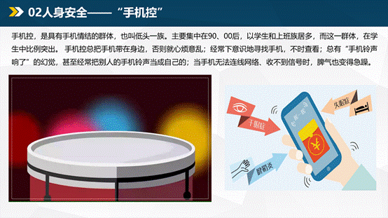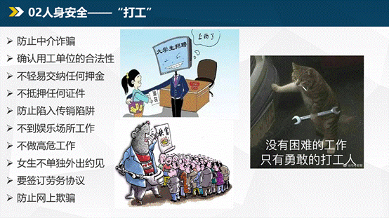 人身安全方面通过“懒癌”、“手机控”、“聚会喝酒”、“打工”四个方面向同学们提供假期指导。通过深入交流,学院了解到很多同学假期开启“夜间模式”、“游戏模式”、“刷剧达人”等假期模式,生活作息极不合理。通过视频等方式,向同学们介绍了熬夜、手机控、酗酒等危害,并教导同学们早睡早起,坚持晨练,养成健康的生活方式。对于打工的同学,提醒工作时要注意疫情防控,保护自身安全。